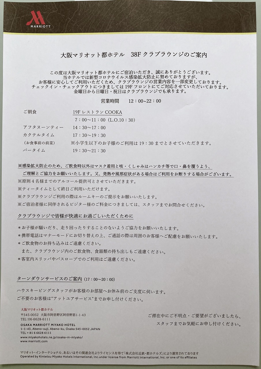 (コロナの影響で時間やサービスは変更になっている可能性があります。また19階にある宿泊客以外でも利用できるロビーラウンジLOUNGE PLUSではありませんのでご注意ください)。