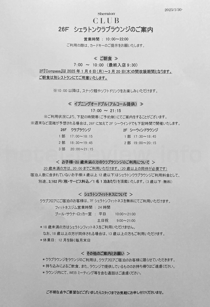 部屋の紹介は以上で、次は26階のシェラトンクラブラウンジを見てみましょう。
