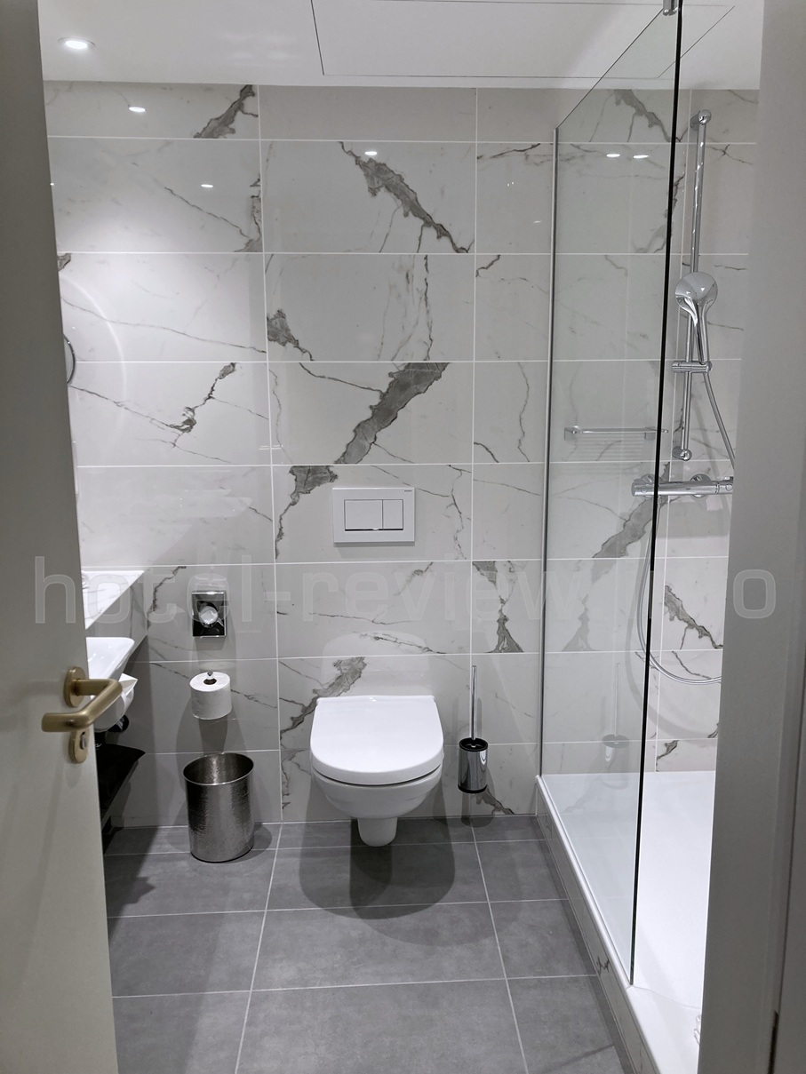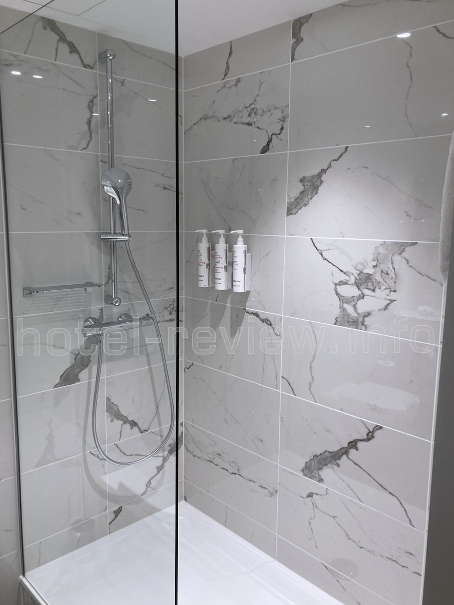 シャワールーム。ヨーロッパあるあるのカーテンが無く、ガラス戸が半分まであるタイプ。毎回思うのですが、これではどんなに隅で浴びても外に水が跳ねてびちゃびちゃになるんですが。