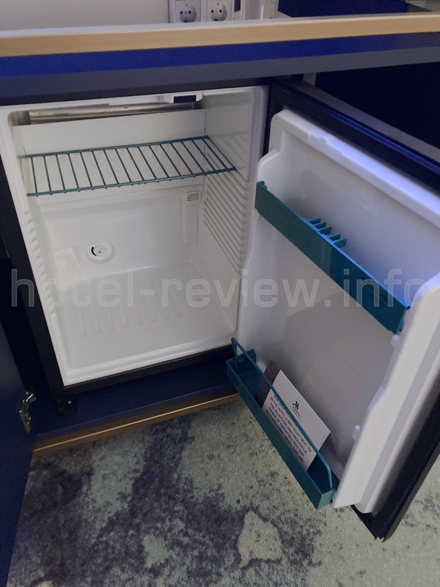 テレビの下にはミニバー。ヨーロッパでは、ミネラルウォーターはグラスのボトルでの提供です。