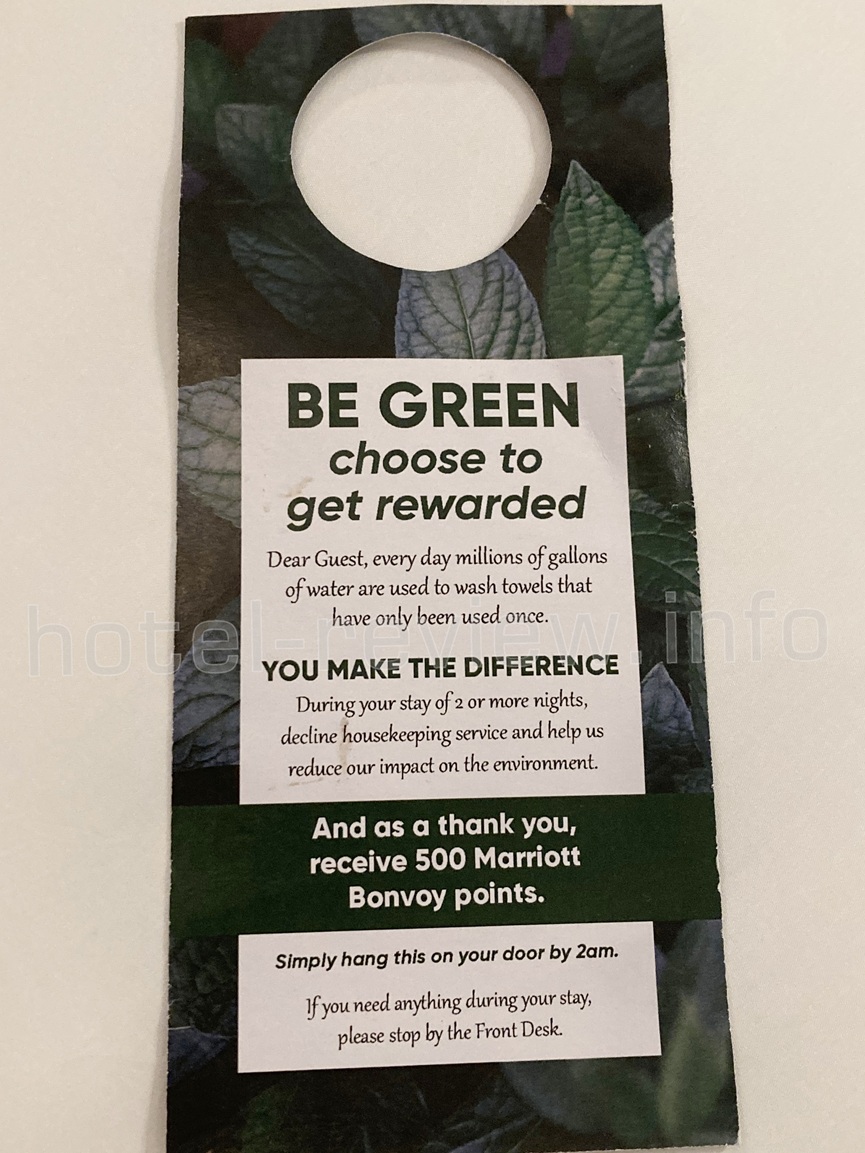 マリオット関連でもうひとつ。たまに見かけますが「ベッドメイクを断ると500ポイントあげます」特典。2泊以上のステイでこれをドアノブに掛け、部屋の清掃を辞退することでポイントが貰えます。