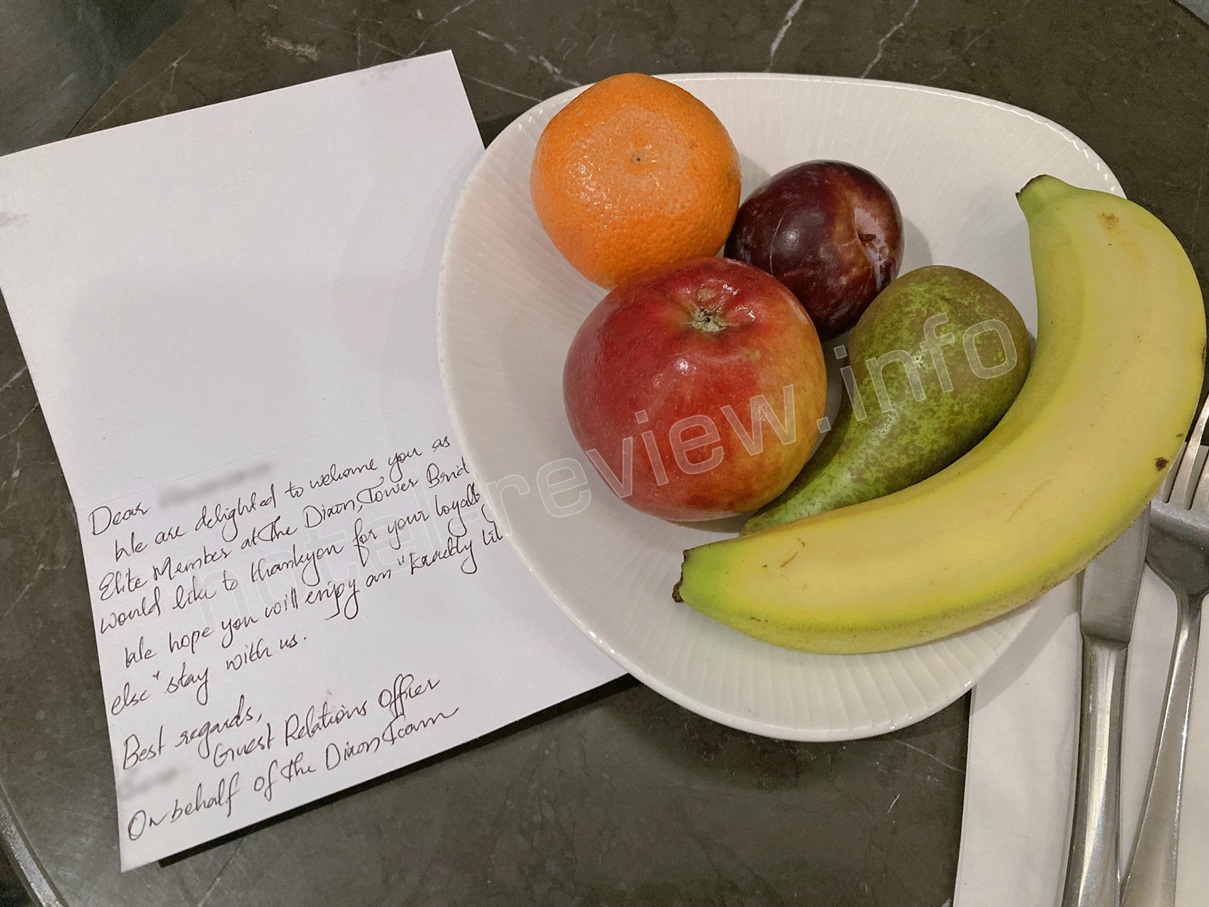 しばらくするとドアベルが鳴り、ウエルカムフルーツと手書きのカードを持って来てくれました。マリオットの特典もしっかり対応してますね。