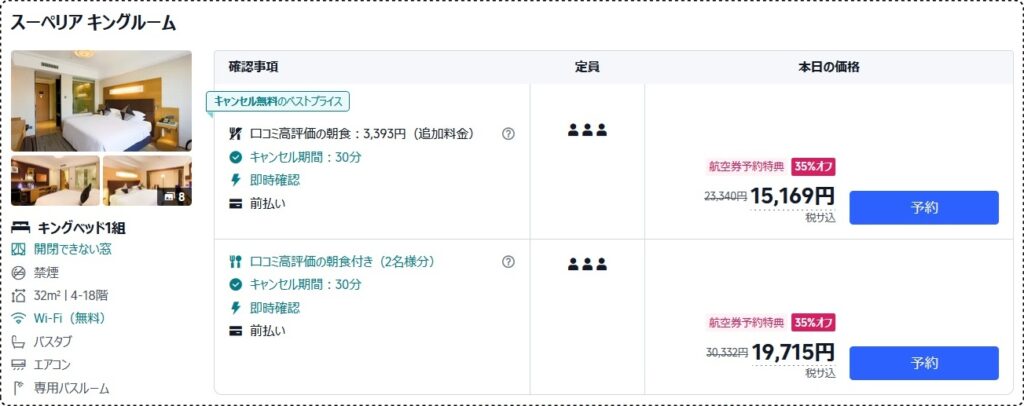 今回は最安値のお部屋が税サ込みで1泊15,169円。